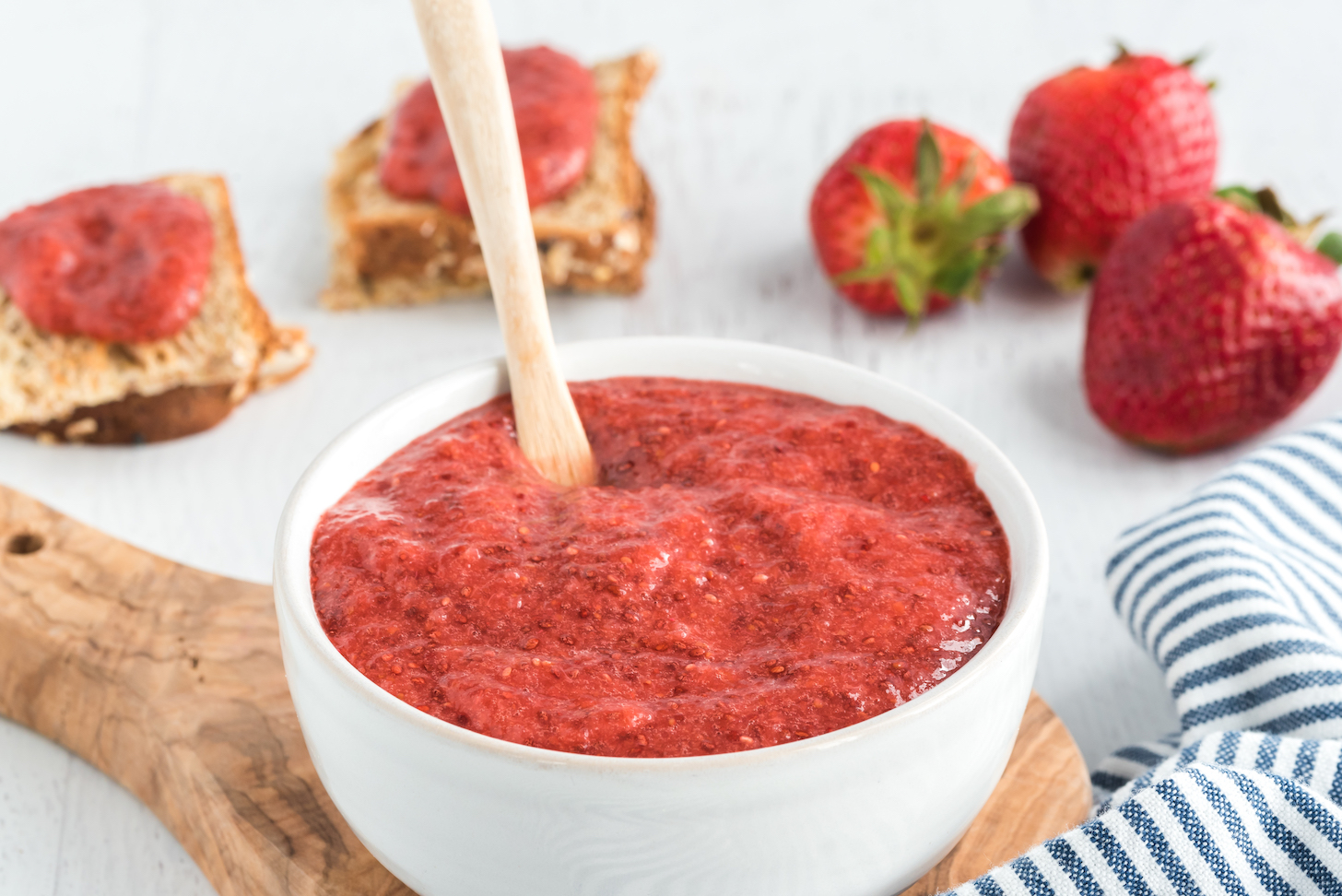 When in doubt, freeze it! This is a good motto to keep in mind whenever you have fruit that is nearing expiration and you’re unsure if you’ll enjoy it before it’s time to say goodbye. At some point, you may open your freezer door and find that fruit, wondering what the heck you’re going to do with it now. We have a solution — make nutritiously delicious homemade jam! Pears, strawberries, and chia pack a ton of fiber. Strawberries contain phytonutrients that have been shown to help with skin, brain, and heart health. And chia seeds bring lots of bone-supporting minerals like magnesium, calcium, iron, and phosphorus. Share this jam with friends and family and let them know that your homemade jam is not only delicious but also good for their health!