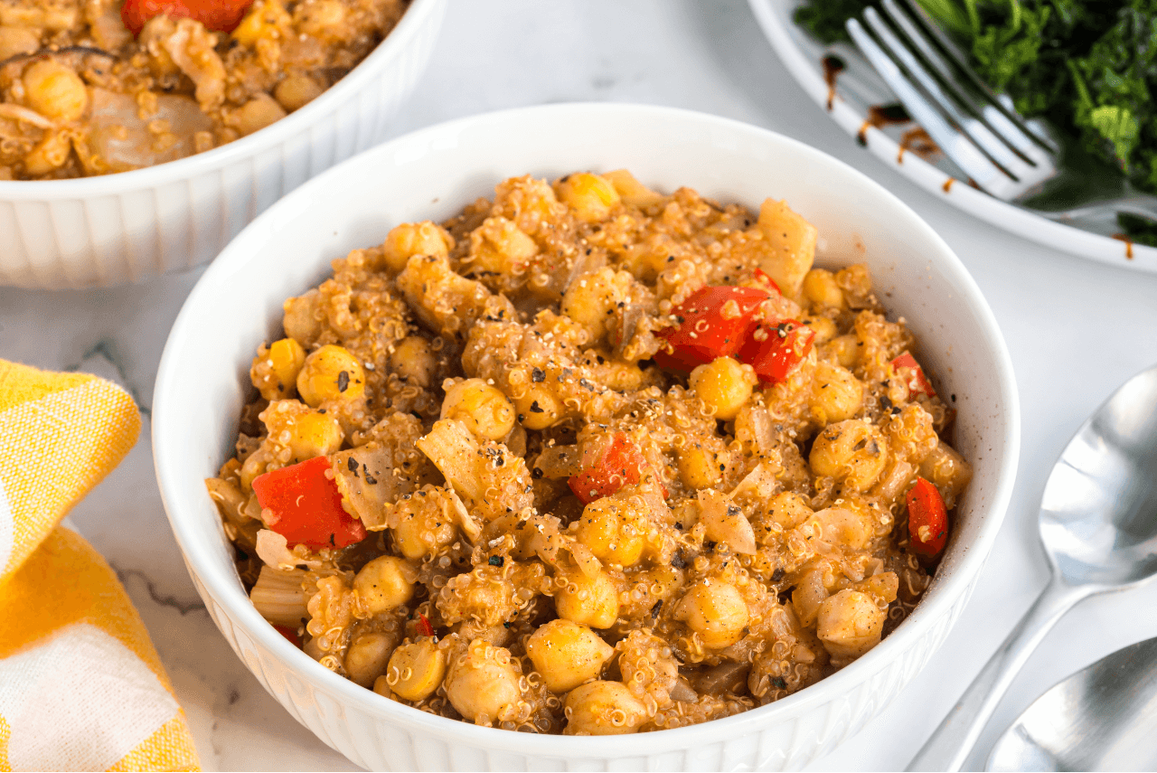 This recipe offers an opportunity to see how a variety of spices, like curry, fennel, paprika, basil, nutmeg, and bay leaf, come together to create a warm and comforting meal. A cross between a casserole and a stew, quinoa and chickpeas are simmered with warm, earthy spices, and balanced with the sweetness of dried figs. Did someone say, “cozy”?