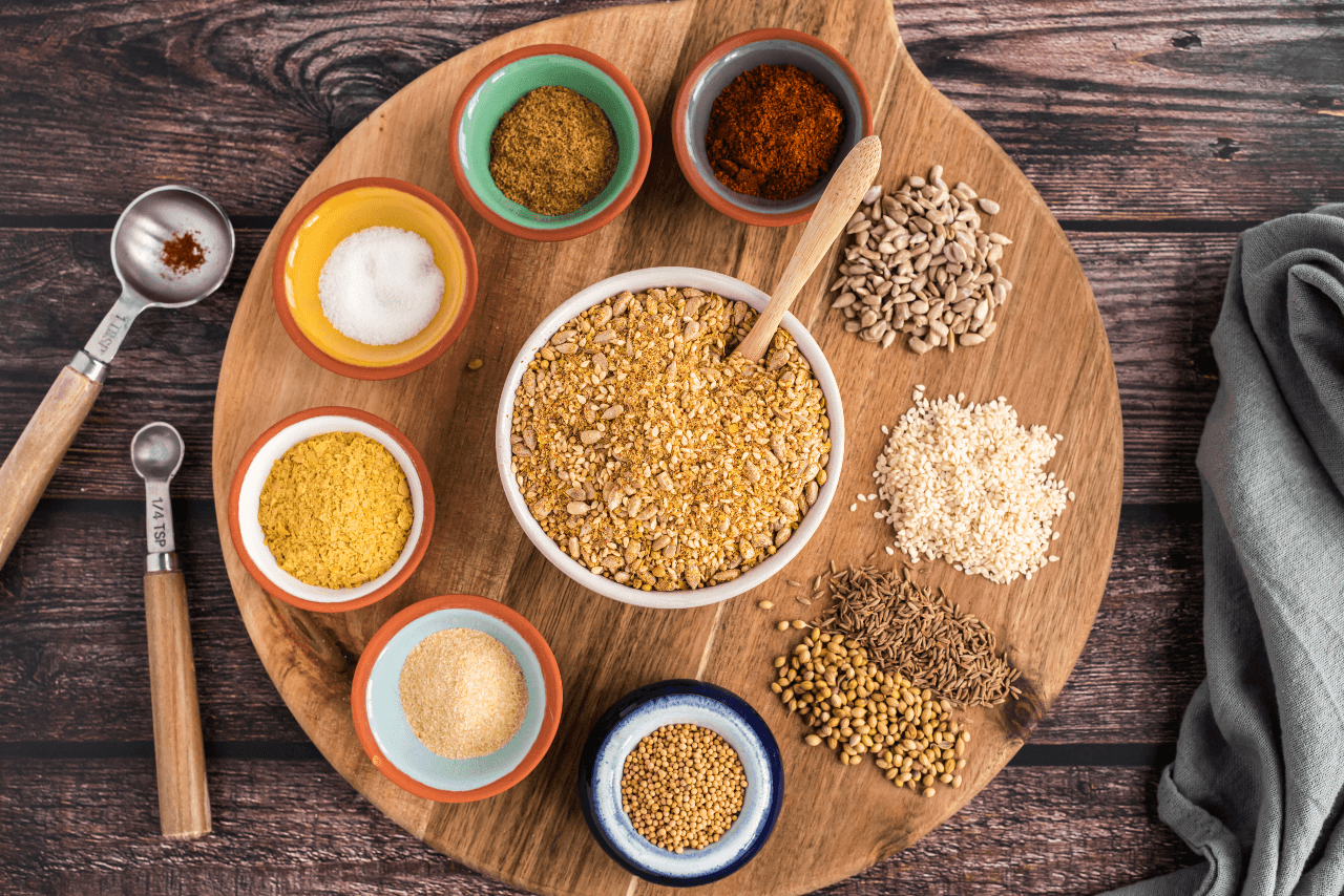 This easy-to-make blend is bursting with flavor from the variety of healthy seeds and spices and can transform any meal from meh to magnifico. Sunflower and sesame seeds add a taste of nuttiness, coriander, cumin, and mustard seeds offer an exotic spice experience, and nutritional yeast adds a bit of umami. Enjoy this crunchy mixture on top of steamed vegetables, grain bowls, fresh salads, and more!
