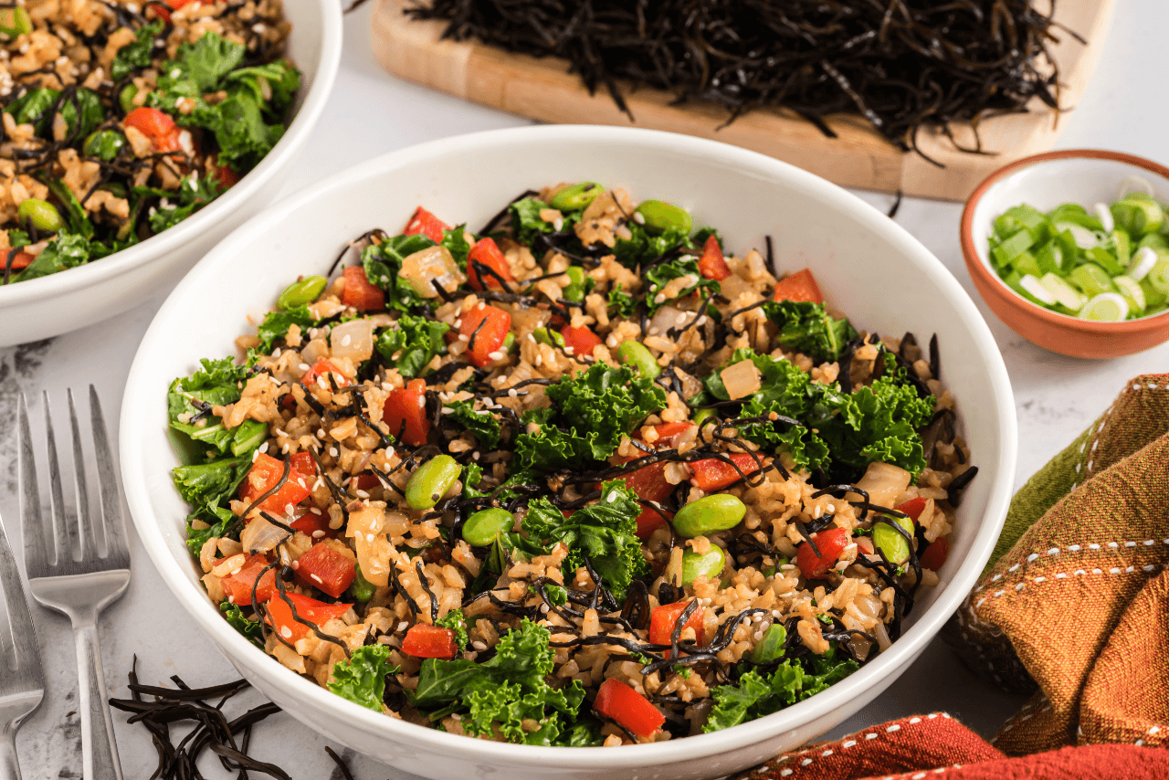 Mineral-rich, sea veggie arame is sold in its dry form and needs to be rehydrated before using. With its mild flavor, it is a well-suited addition to a variety of taste profiles in stir-fries, salads, and bowls. Here, kale, edamame, peppers, and onions add pops of color, flavor, and nutrition. To highlight its natural and beautiful black color, make this dish with red or brown rice (black works too, but you won’t see the pretty arame!).