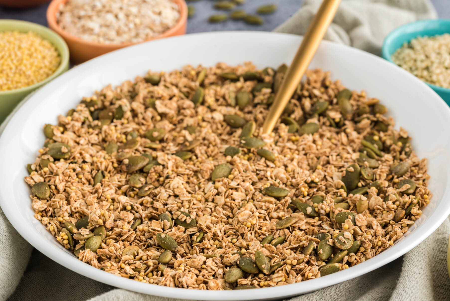 - A liquid to help make the granola crispy when baked (normally oil, but oil-free options include applesauce and aquafaba)