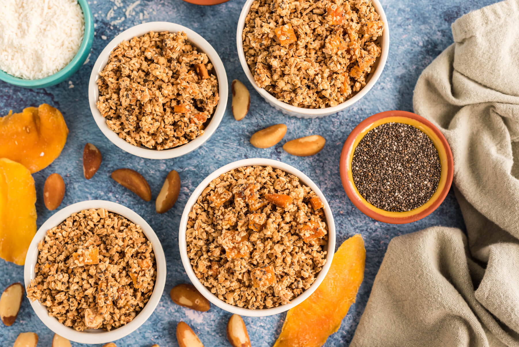 In this ode to tropical islands, granola ingredients, including sweet mango, shredded coconut, chia seeds, and Brazil nuts, combine deliciously to create an on-the-go breakfast or snack anywhere in the world! What’s great about this granola is that, in addition to fiber, protein, and healthy fats, you’ll get a daily dose of selenium from the Brazil nuts.