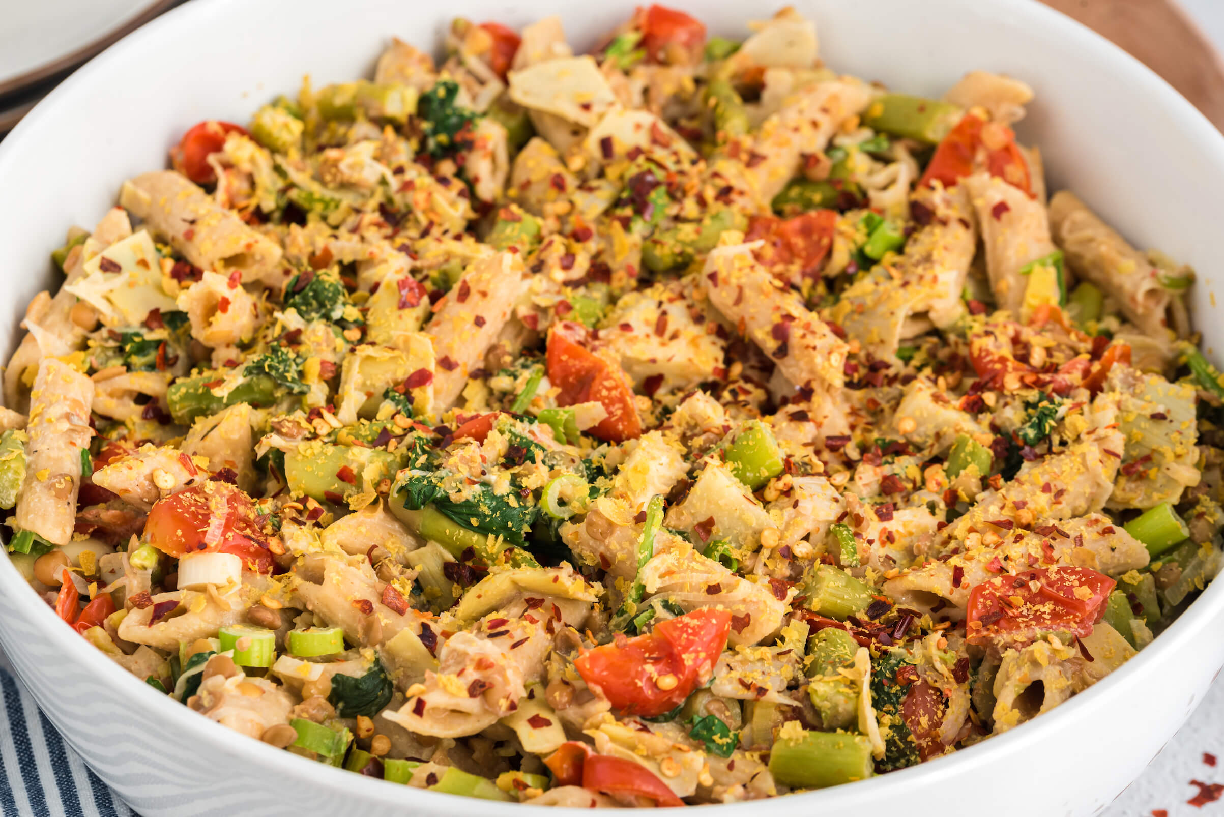 Artichokes are among the top quercetin-rich veggies — and boy, oh boy, do we love them (and hope you do, too!). This Cheesy Artichoke and Asparagus Penne is loaded with powerful antioxidants, phytochemicals, and essential minerals like magnesium, potassium, niacin, and folate. Adding artichokes to your diet regularly is a great way to lower inflammation and increase healing through plant power. What’s more, this colorful pasta has tons of fiber from the veggies, whole grains, and lentils, as well as protein from the lentils — so you’ve got the complete package when it comes to this meal.