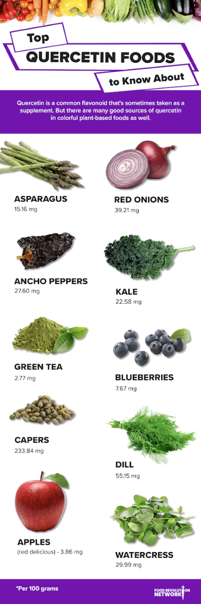 Your body can’t make its own quercetin, so the only way to take advantage of this amazing compound is to get it from food or supplements. If you’re eating a nutritionally excellent diet with a variety of whole plant foods, the good news is that you can expect to consume up to 13 milligrams of quercetin per day.