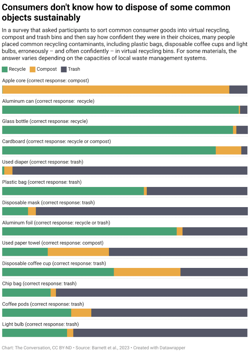 Our second study asked participants to sort common consumer goods into virtual recycling, compost, and trash bins and then say how confident they were in their choices. Many people placed common recycling contaminants, including plastic bags (58%), disposable coffee cups (46%), and light bulbs (26%), erroneously — and often confidently — in the virtual recycling bins. For a few materials, such as cardboard and aluminum foil, the correct answer can vary depending on the capacities of local waste management systems.