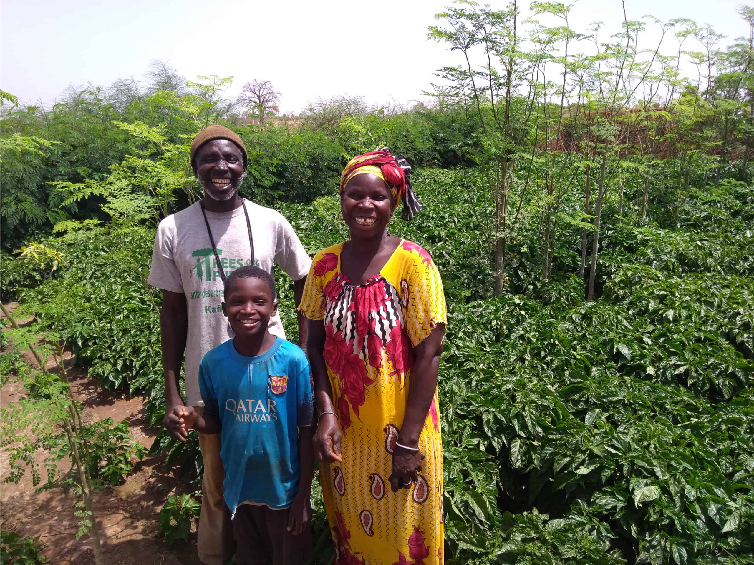 The impact of Bassirou’s newfound knowledge on his land has been stunning. He now has more than 2,000 trees that form the canopy of a thriving “forest garden,” providing shade for crops, keeping moisture in the soils, and delivering a host of nutritional and other benefits. Composting has allowed him to improve his soil organically, so he’s no longer dependent on expensive synthetic fertilizers. With his diversified harvest of fresh vegetables, including tomatoes and eggplants, Bassirou is able to feed his family and even help out others when they are sick.